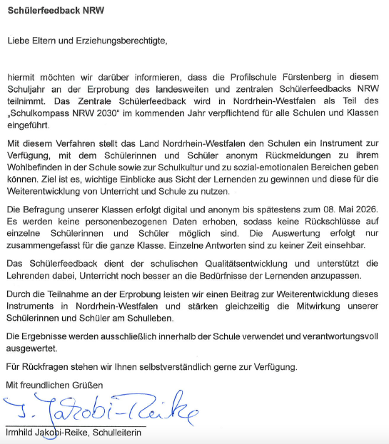 Die Profilschule Fürstenberg nimmt seit März 2025 als eine von fünf Schulen aus dem Regierungsbezirk Detmold am Forschungsprojekt KIMADU (Künstliche Intelligenz im Mathematik- und Deutschunterricht) des Landes NRW teil. Die Universität Siegen begleitet im Auftrag der Landesregierung insgesamt 25 weiterführende Schulen aus NRW, die aus 120 Bewerbern ausgesucht wurden, wissenschaftlich bei der Einführung und Nutzung von Künstlicher Intelligenz (KI) im Unterricht.