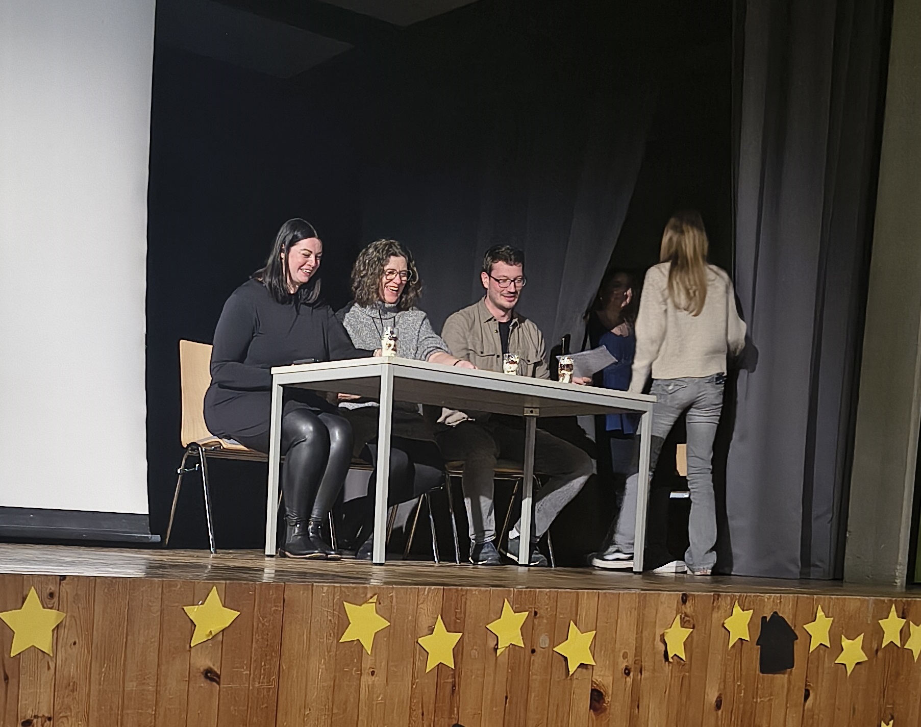 Ein Publikumsliebling des Abends war das Kochduell der Hauswirtschafts-AGs der Jahrgänge 7/8 sowie 9/10. Das Schulleitungsteam mit Irmhild Jakobi-Reike, Simon Reichert und Corinna Peters wurde dabei mit einem Hauptgericht und einem Nachtisch verwöhnt. Am Ende setzten sich die älteren Schülerinnen und Schüler mit einem knappen Vorsprung von zwei Punkten durch.